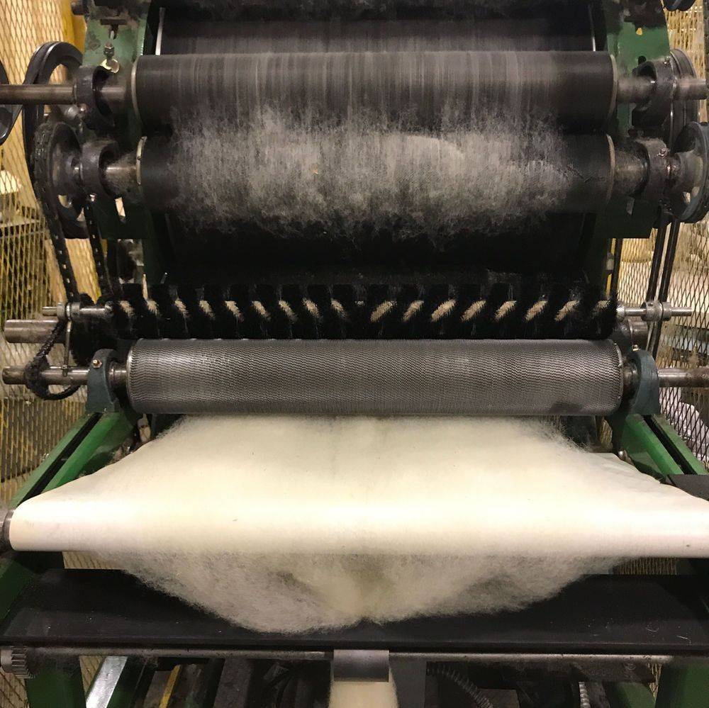 After the fleece has been scoured, it will be fiber opened. This allows for easier and more consistent carding. Then tumbled again to remove fine particles of VM. Once this is done, the fibre is carded in to a carded roving or batts.